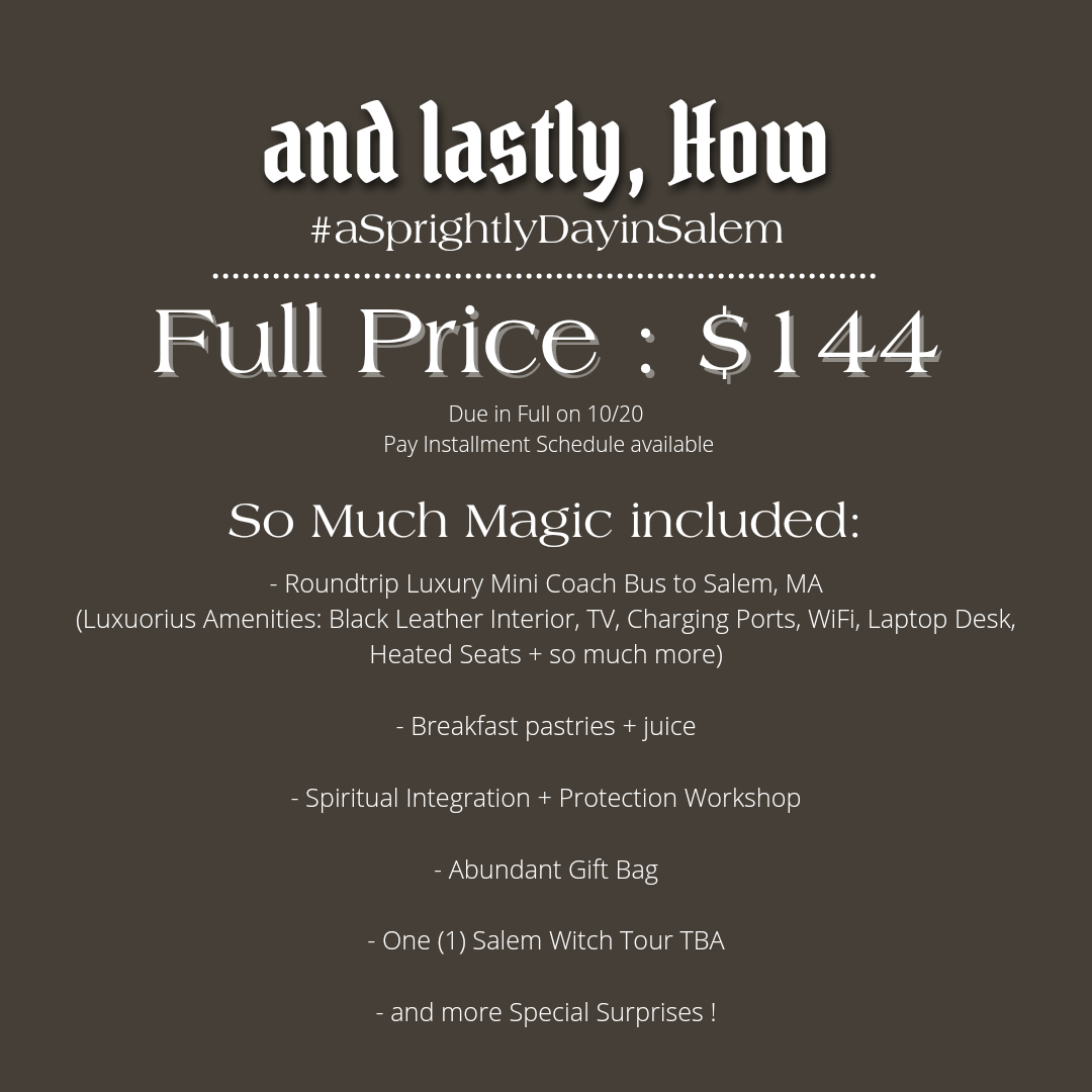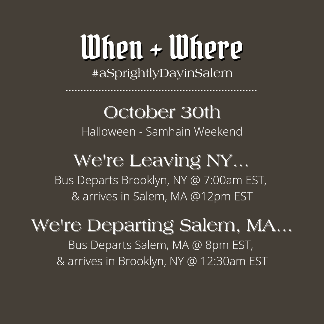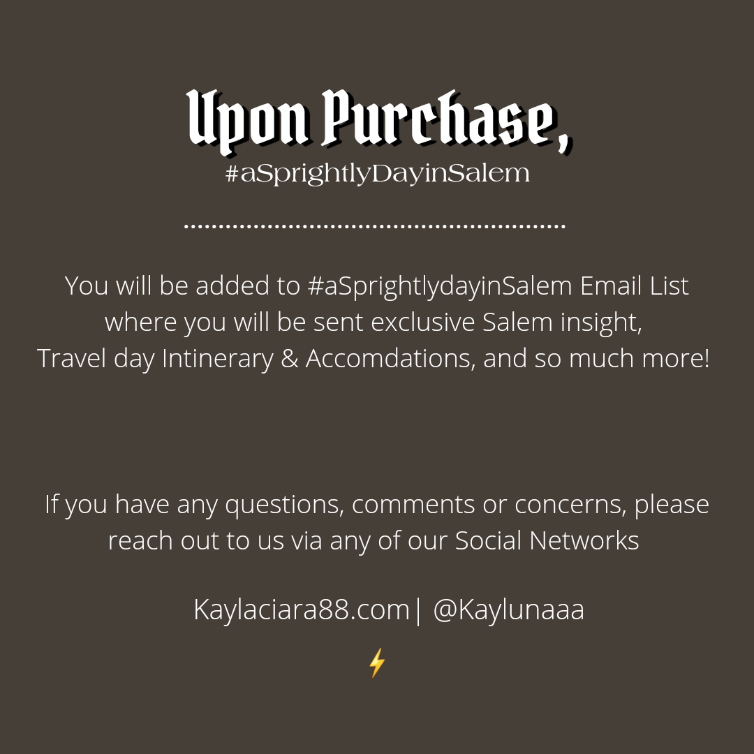 - Upon purchase, you will be added to our #aSprightlyDayinSalem Email List where we will cover more details, share Salem insight, our trip Itinerary & more!